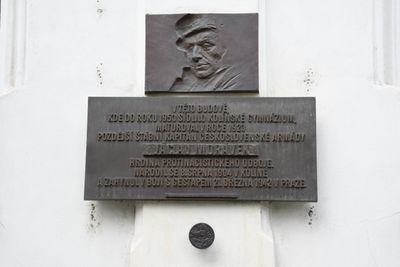 Plaque to Václav Morávek in Kolín, dvojice pamětních desek s textem a s portrétním reliéfem na obchodní akademii (bývalém gymnáziu)