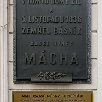 Here-died plaque to K. H. Mácha, memorial plaque in Máchova street, Litoměřice, Czechia