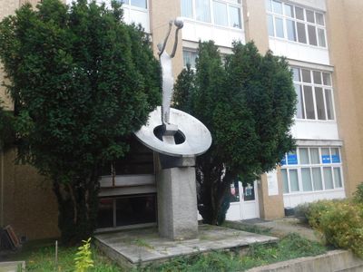 Kovová plastika před budovou spojů v Havlíčkově Brodě, statue in Havlíčkův Brod, Czech Republic