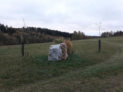 Památný kámen s datem výstavby tůně severozápadně od Popovic