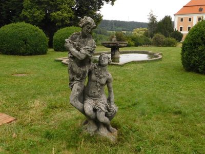 Socha Meleagros a Atalanta v zámeckém parku ve Valči, statue in Valeč, Czech Republic