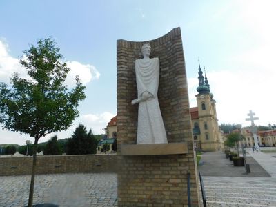 Socha svatého Cyrila ve vstupu do poutního areálu na Velehradě, statue in Velehrad, Czech Republic