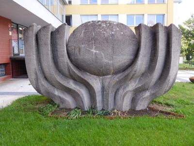 Kamenná plastika Slunce u koleje UK Kajetánka v Radimově ulici
