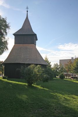 Dřevěná zvonice u kostela svaté Markéty ve středu Vysočan u Nového Bydžova