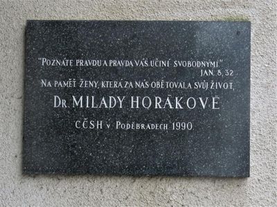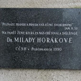 Pamětní deska Milady Horákové na kostele Krále Jiřího z Poděbrad v Poděbradech, pamětní deska v obci Poděbrady v okrese Nymburk