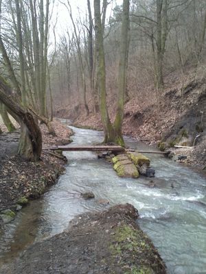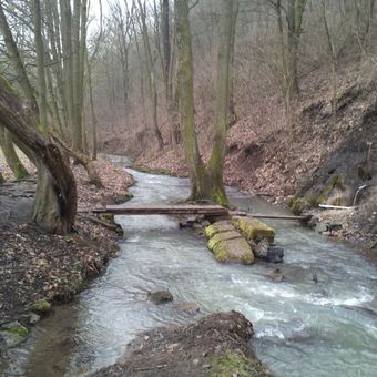 Lávka k prameni u Havlíčkova mlýna, jednoduchá nízká lávka přes Suchomastský potok, nedaleko od lávky s turistickou stezkou