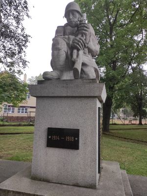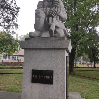 Pomník obětem 1. světové války, Vratimov, podstavec se sochou zakleklého vojáka v parku u sokolovny ve Vratimově