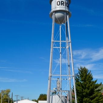 West Water Tower and Ground Storage Tank, Torre idrica storica e serbatoio di stoccaggio a Orion, Illinois.