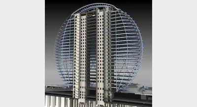 La struttura circolare si eleva per 121 metri con un design a griglia diagonale in acciaio che elimina la necessità di colonne interne.