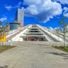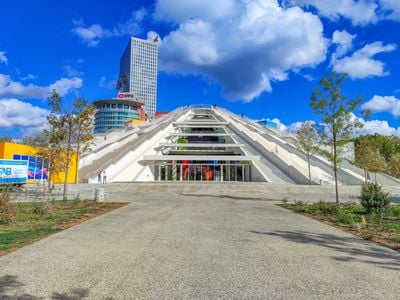 La Piramide di Tirana presenta una costruzione in cemento e vetro con forma triangolare che si eleva da una base quadrata.