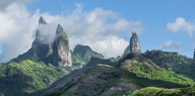 Quattro pilastri di basalto si innalzano dal paesaggio di Ua Pou, con il Monte Oave che raggiunge 1.230 metri sopra le acque del Pacifico.