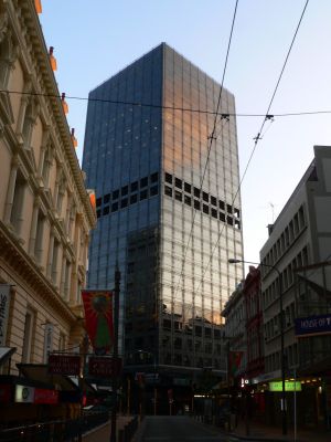 Lo State Insurance Building è una torre per uffici high-tech nel quartiere commerciale di Wellington, con una facciata in vetro scuro e granito brasiliano. La struttura utilizza un telaio tubolare in acciaio attorno al perimetro e comprende più livelli di spazi commerciali, alcuni sottoterra.