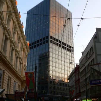 L'Aon Centre si eleva per 102 metri sopra il distretto commerciale di Wellington, con esterno in vetro scuro e facciata in granito brasiliano.