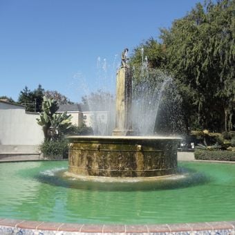 I mosaici in terracotta intorno alla fontana contengono motivi che raccontano storie sulla fondazione e lo sviluppo di Beverly Hills.