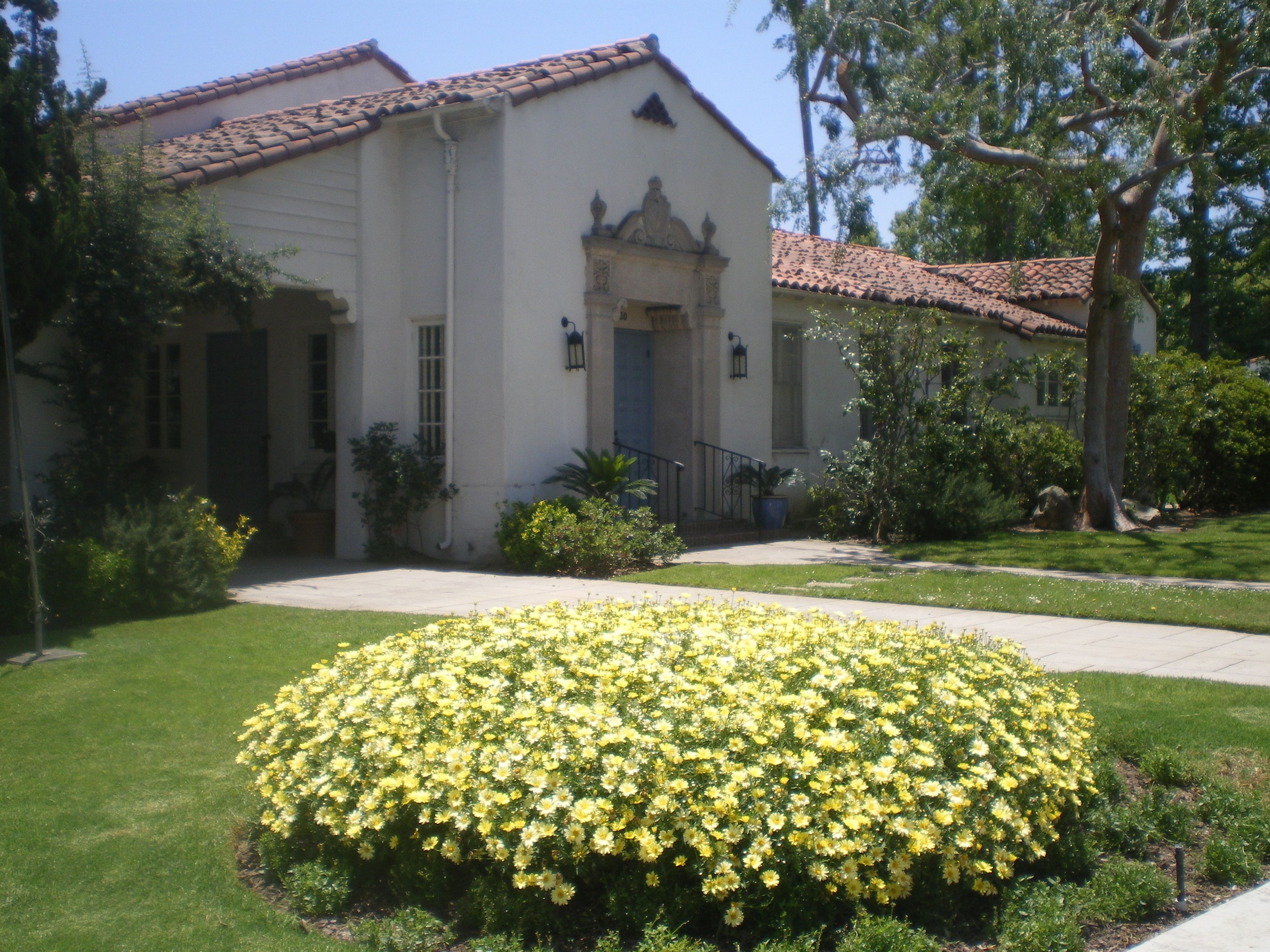 Il Beverly Hills Women's Club presenta muri in stucco, tetto a tegole, pilastri, mensole decorate e finestre a battente al 1700 Chevy Chase Drive.