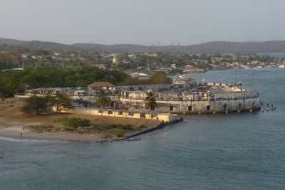 Il Castello di San Luis de Bocachica sorge all'ingresso del porto di Cartagena, con muri in pietra e postazioni difensive lungo la costa.