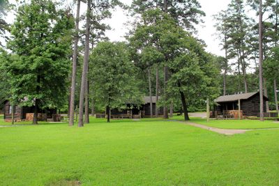 Le capanne del Parco Statale del Lago Caddo presentano strutture in legno con fondamenta in pietra e grandi finestre nella costruzione.