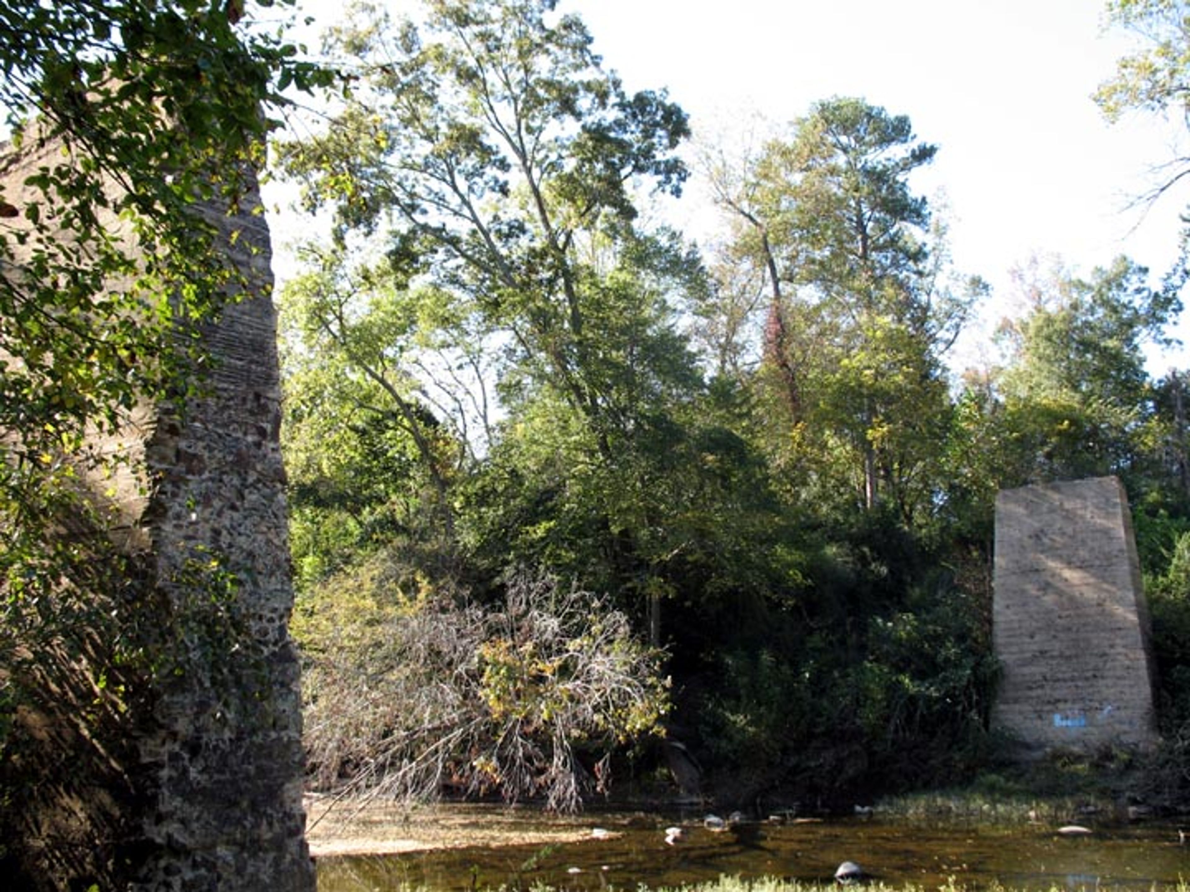 I pilastri in pietra rimangono visibili dal nuovo ponte in cemento, situato a nord dell'attraversamento originale vicino alla Strada Statale 160.