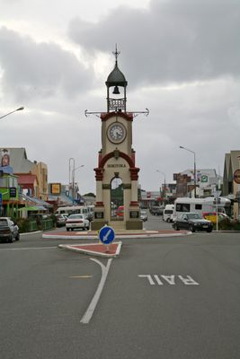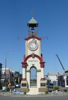 La torre dell'orologio si trova in una rotatoria centrale sulla strada principale, fungendo da punto di riferimento per l'orientamento a Hokitika.