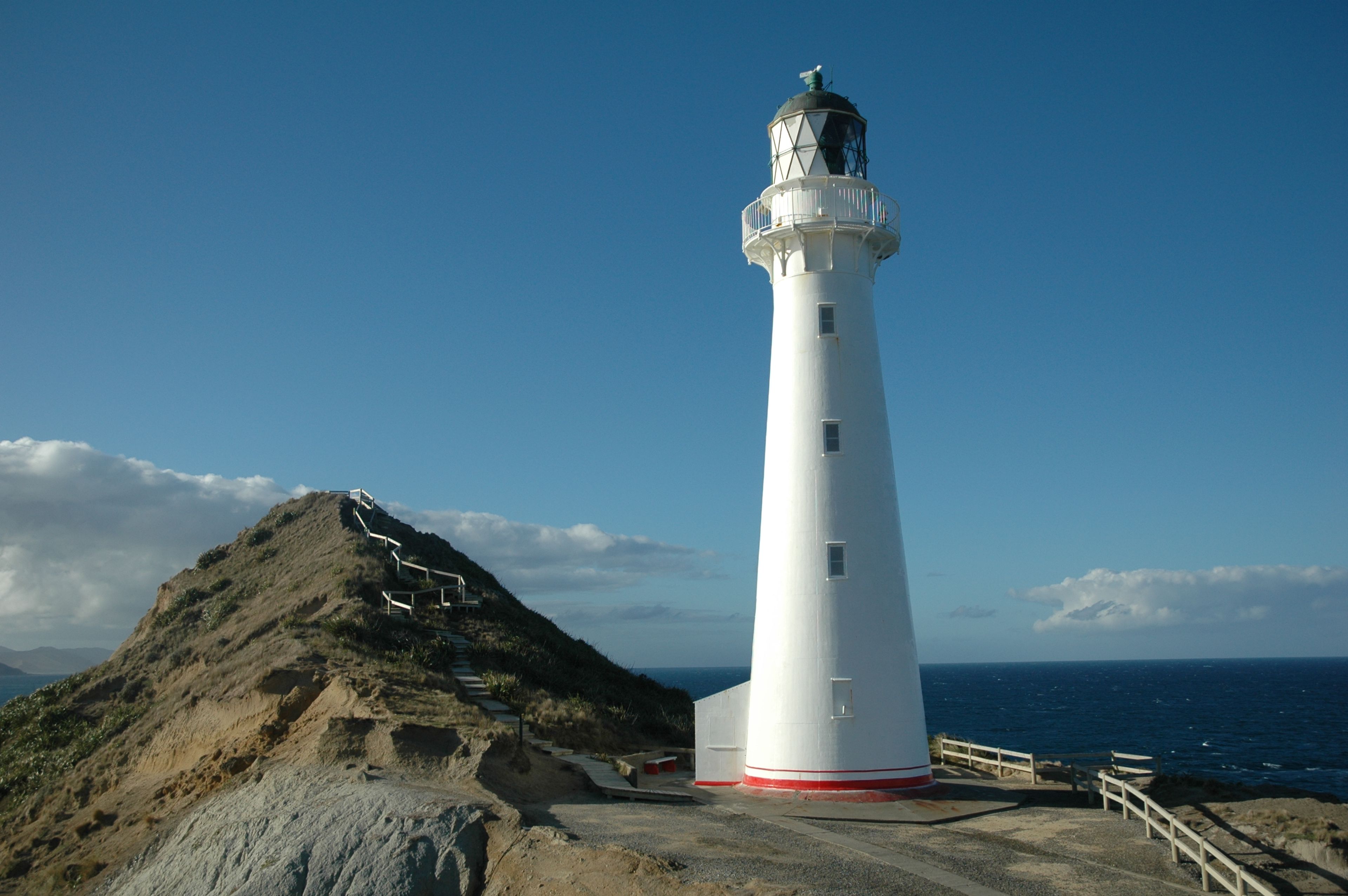 La torre cilindrica bianca con cupola rossa si eleva per 23 metri sulla costa rocciosa della costa orientale dell'Isola del Nord.