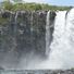 L'acqua bianca precipita su una parete naturale di roccia scura, creando una nebbia costante nell'area circostante.