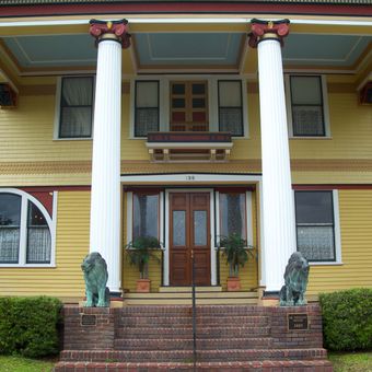 La Casa Dr. P. Phillips presenta un'architettura in stile Shingle con un portico ionico prominente e si sviluppa su due piani e mezzo nel centro di Orlando.