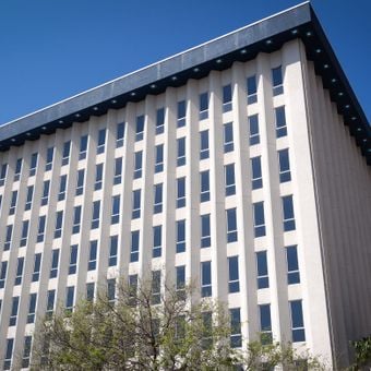 La struttura architettonica moderna di otto piani presenta linee pulite e forme geometriche tipiche degli edifici municipali della metà del secolo.