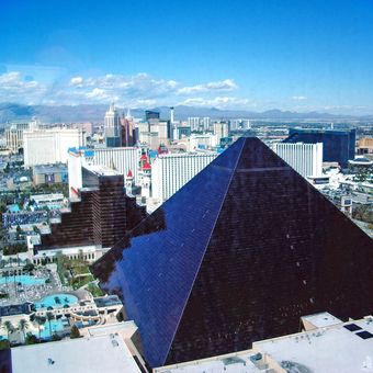 Il Luxor presenta una struttura piramidale nera di 30 piani con 2.526 camere e un atrio di 29 milioni di piedi cubi.