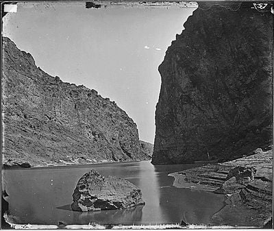 Il Canyon Nero si estende lungo il fiume Colorado con pareti vulcaniche ripide che si innalzano dall'acqua tra le montagne El Dorado e Black.