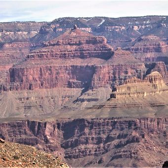 Holy Grail Temple si innalza per 2.046 metri sul livello del mare, mostrando strati di arenaria Coconino e formazione Hermit nell'anfiteatro Shinumo.