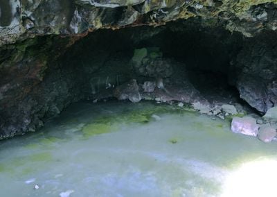 La Grotta di Ghiaccio del Vulcano Bandera presenta formazioni naturali di ghiaccio che creano riflessi blu-verdi quando colpite dalla luce solare diretta.