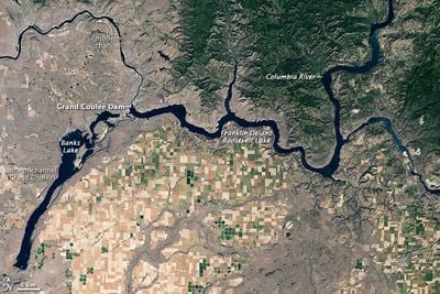 L'acqua del fiume Columbia viene pompata a 280 piedi verso l'alto fino al lago Banks, che contiene circa 1.237.000 acri-piedi d'acqua nell'antico canale dell'Era Glaciale.