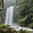 La cascata di 30 metri scende attraverso felci dense e alberi alti in una gola profonda nella foresta pluviale temperata.