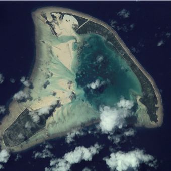 L'atollo triangolare si estende per 11,6 chilometri quadrati con due isole principali, Buariki e Takaeang, collegate da banchi di sabbia a nord.
