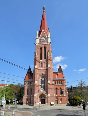 La chiesa in mattoni rossi si erge con archi a punta, guglie e finestre in stile gotico nel quartiere viennese di Penzing.