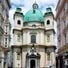 La facciata bianca e gialla della Chiesa di San Pietro presenta due torri curve e una cupola centrale tra le strette vie di Vienna.
