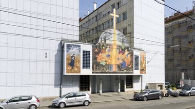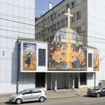 La facciata della chiesa, completata nel 1996 dall'artista Arik Brauer, mostra scene bibliche sopra l'ingresso, integrando arte religiosa nel design architettonico.