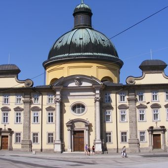La Kajetanerkirche presenta una vasta facciata palatina con una cupola ovale centrale, due ali simmetriche e un portale d'ingresso con colonne ioniche.