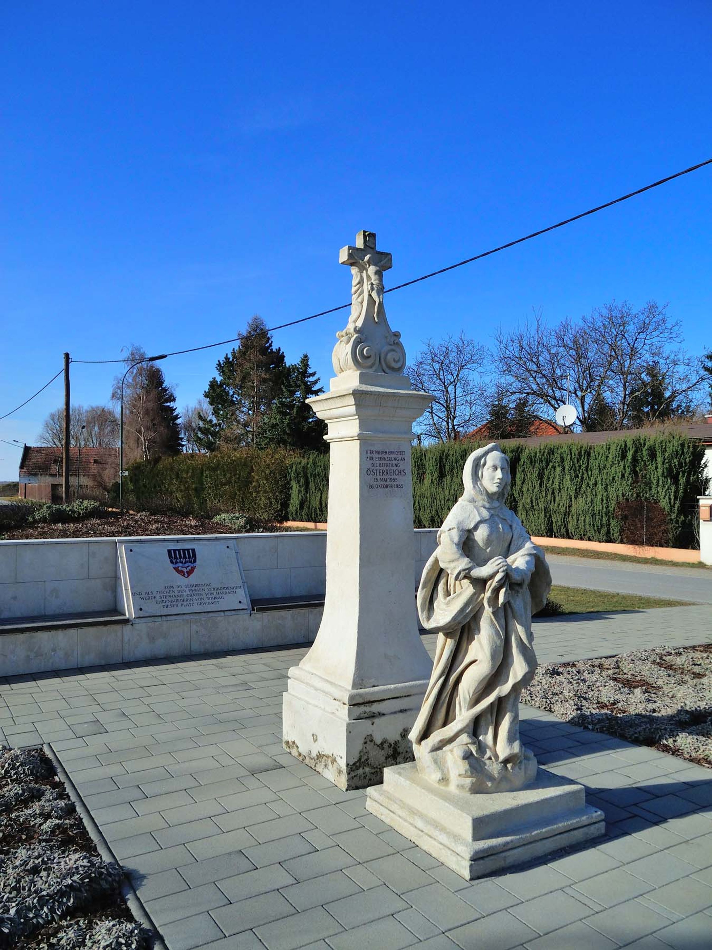 Madonnenfigur und barocker Steinbogen des Pfarrhofs