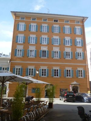 L'edificio di tre piani al Waagplatz 3 si erge nel centro di Salisburgo con una facciata del 1860 e molteplici elementi architettonici.