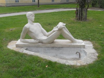 Vogeltränke "Liegender Jüngling", Plastik von Artur Hecke in der Wohnhausanlage Heinrich-Hajek-Hof, Wien Rudolfsheim-Fünfhaus