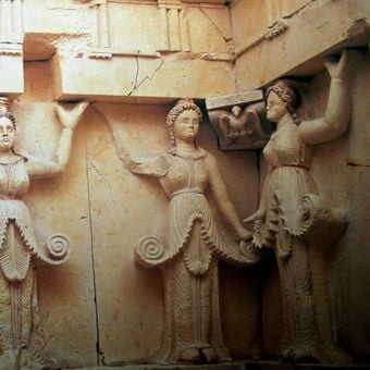 La camera sepolcrale presenta dieci figure femminili scolpite, chiamate cariatidi, che sostengono il soffitto con le braccia alzate in stile ellenistico.