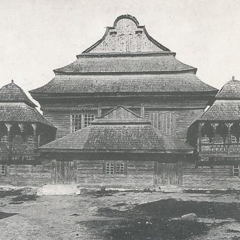 La sinagoga in legno presentava un tetto a tre livelli alto quattordici metri e quattro colonne angolari che sostenevano una volta elaborata.