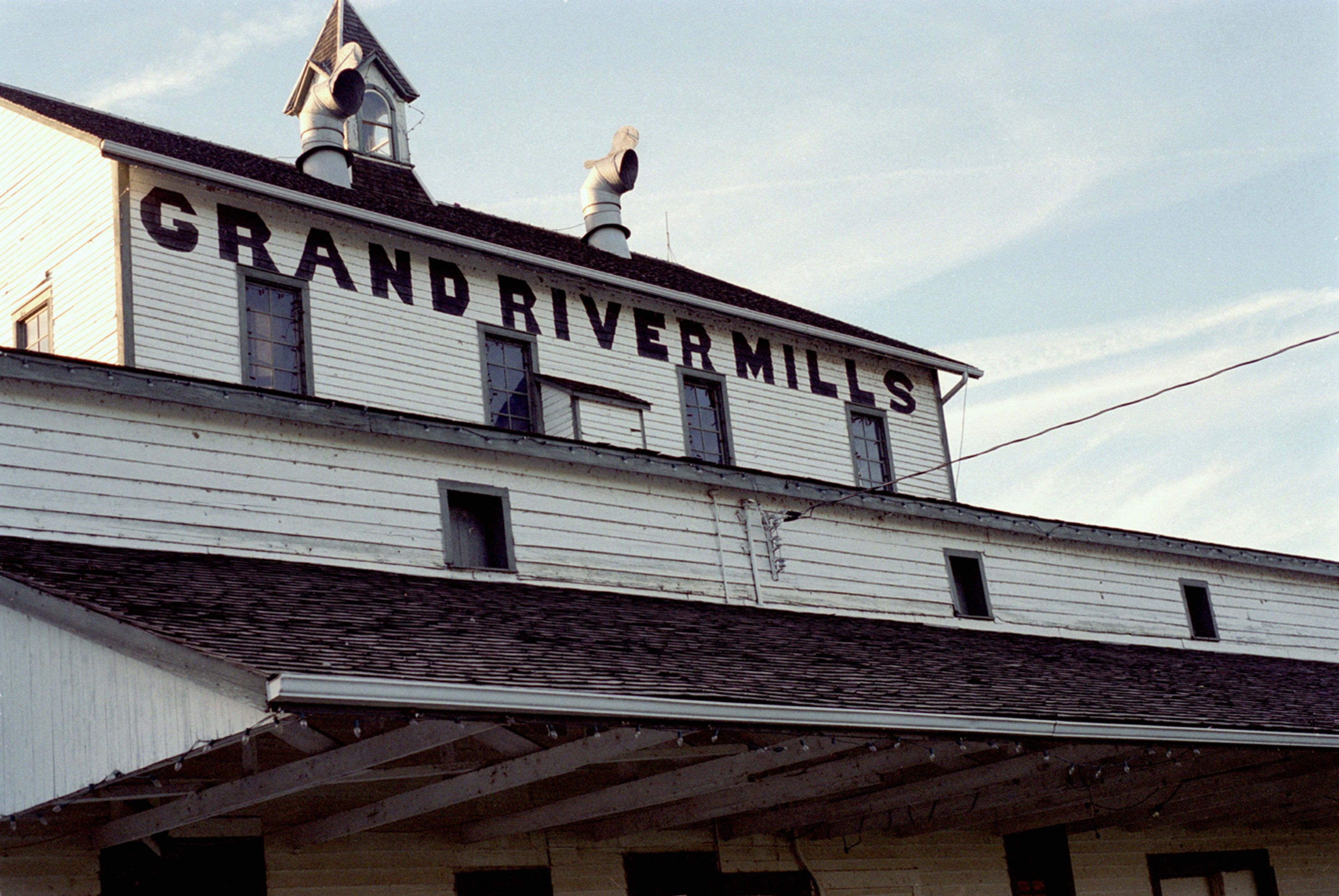 Il Mulino Caledonia sorge lungo il fiume Grand con tegole di cedro sul tetto e rivestimento in pino sulle pareti esterne.