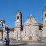La chiesa centrale presenta una facciata barocca bianca e dorata con torri gemelle, colonne in marmo e statue religiose dettagliate.