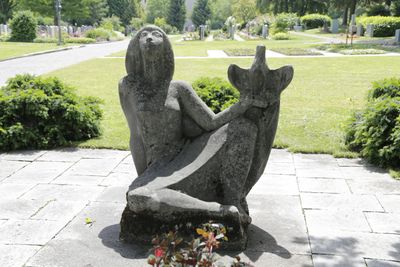 Sitzende Frau mit Taube, sculpture by Uli Schoop at Friedhof Affoltern in Zürich, Switzerland
