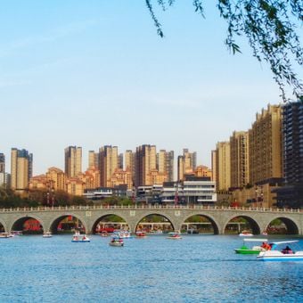 La Diga dei Salici si estende lungo il parco con file di alberi che conducono alla Torre Yuejiang, che offre viste sulle caratteristiche acquatiche circostanti.
