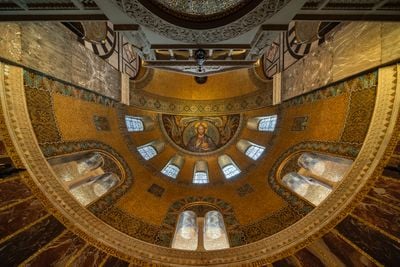 L'interno contiene un mosaico del Cristo Pantocratore nella volta dell'abside e unisce elementi bizantini con caratteristiche architettoniche neoromaniche.