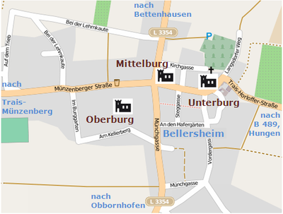 I resti di tre castelli si trovano in Bettenhäuser Straße 1, formando un complesso medievale entro i confini dell'attuale Hungen.