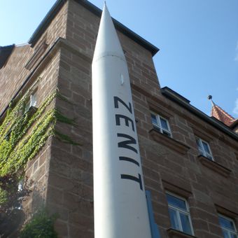 Un razzo sonda Zenit svizzero si erge all'ingresso del museo, rappresentando i primi sviluppi della tecnologia missilistica europea.